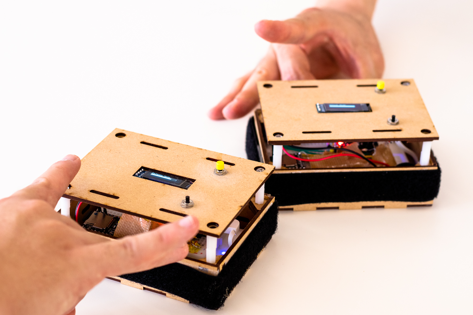 デバイスを指で弾いて、相手に当てるところは同じですが、勝敗は机から落とすのではなく、ディスプレイに表示されている体力ゲージを0にしたほうが勝ちになります。本体には、ターンを切り分けるためのボタンや、リセットスイッチがついています。