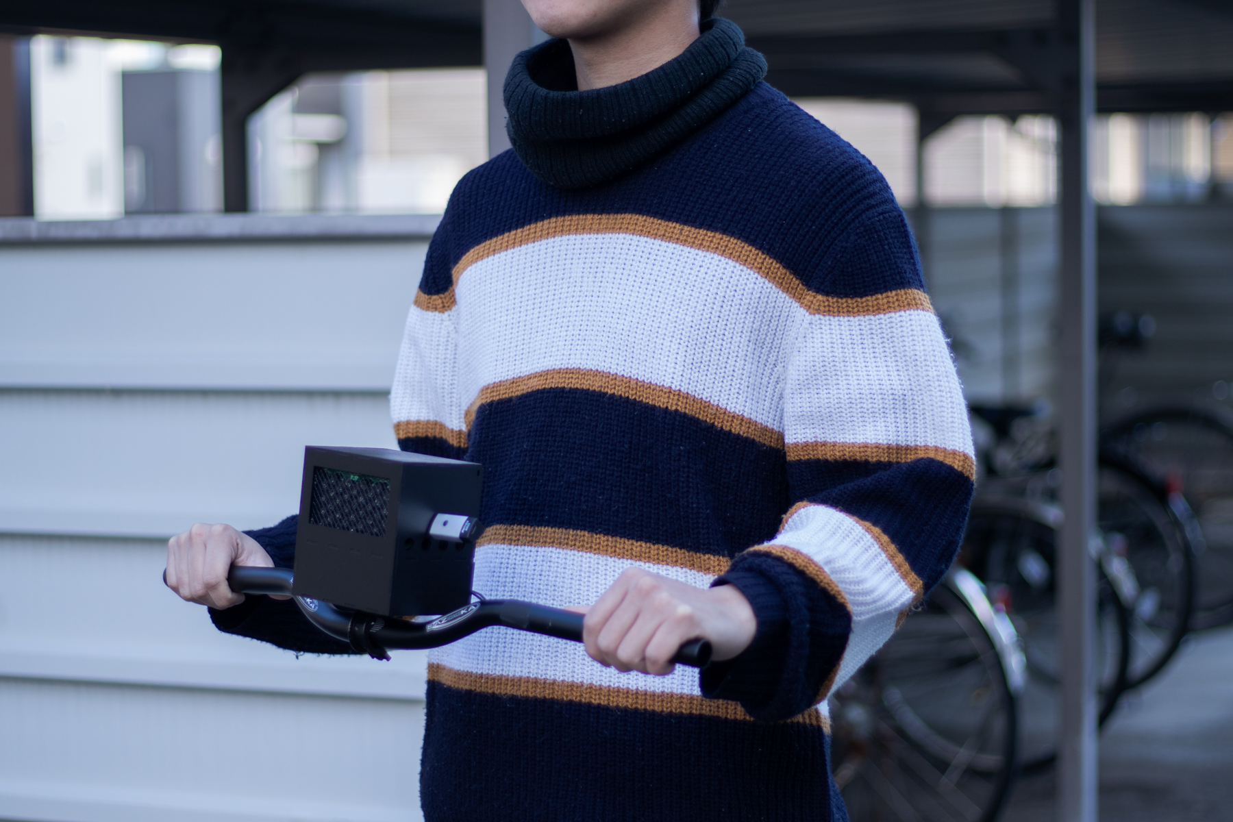 本作品は、指向性スピーカーを使用することで、前方の歩行者にだけ音を届けて、注意を促します。鳴らす音は、アプリで設定することができます。