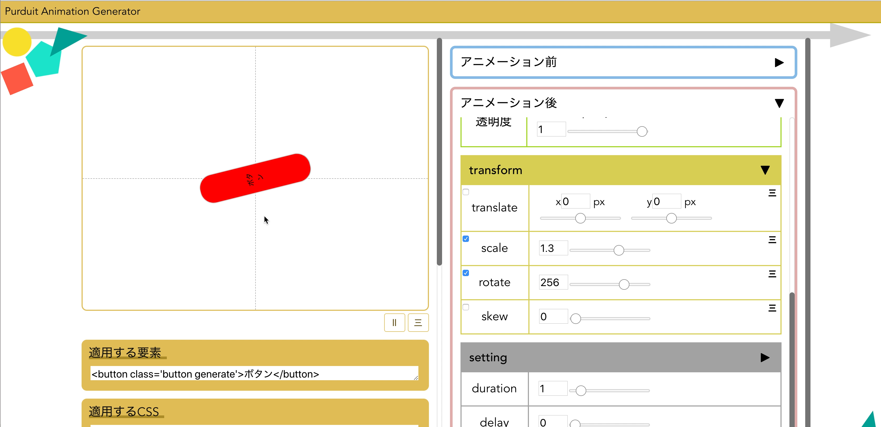 Web制作において、CSSでアニメーションを実装する際、コーディングするまえにテストできるジェネレータがあると便利です。しかし、すでにネット上に存在しているCSSアニメーションジェネレーターは、インタフェースやカスタマイズ性の面で使い勝手がよくありません。 本作品は、それらの問題点を分析し、使いやすいインタフェースを備えたオリジナルのCSSアニメーションジェネレータです。 |