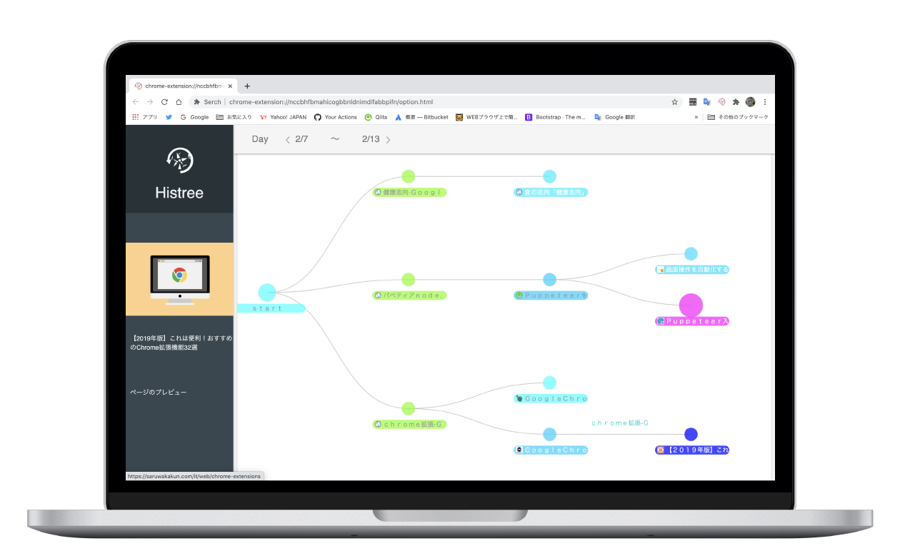 | キャプション | 作業をしているときに、過去に見た参考ページを再度見たくても検索からたどりつけなかったり、ブラウザの履歴から見つからないことがよくあります。本作品は、Google Chromeの拡張機能として動作し、特定の条件を満たした検索履歴だけを表示し、またリンク関係からツリー状に表示することで、思い出したいサイトを見つけやすくします。 |