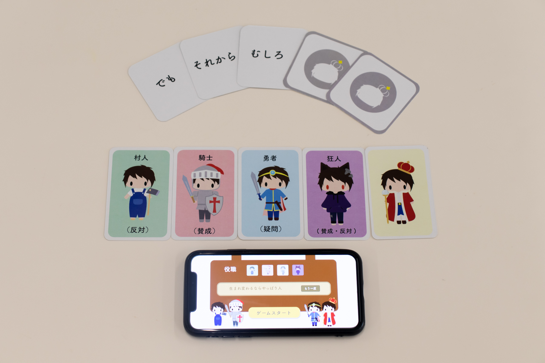 初対面の人同士でグループワークをする際に、緊張を解すためアイスブレイクを行うことがあります。本作品は、アイスブレイクの一環として、プレイヤーがあるテーマに対して、与えられた役割に応じた立場で議論を行います。役割は「賛成」「反対」「疑問」等があります。 役割というペルソナを設けたり、議論の開始を用意された接続詞から始めるという制約を作ることで、話すことが苦手な人でも意見を言い出しやすくしています。 |