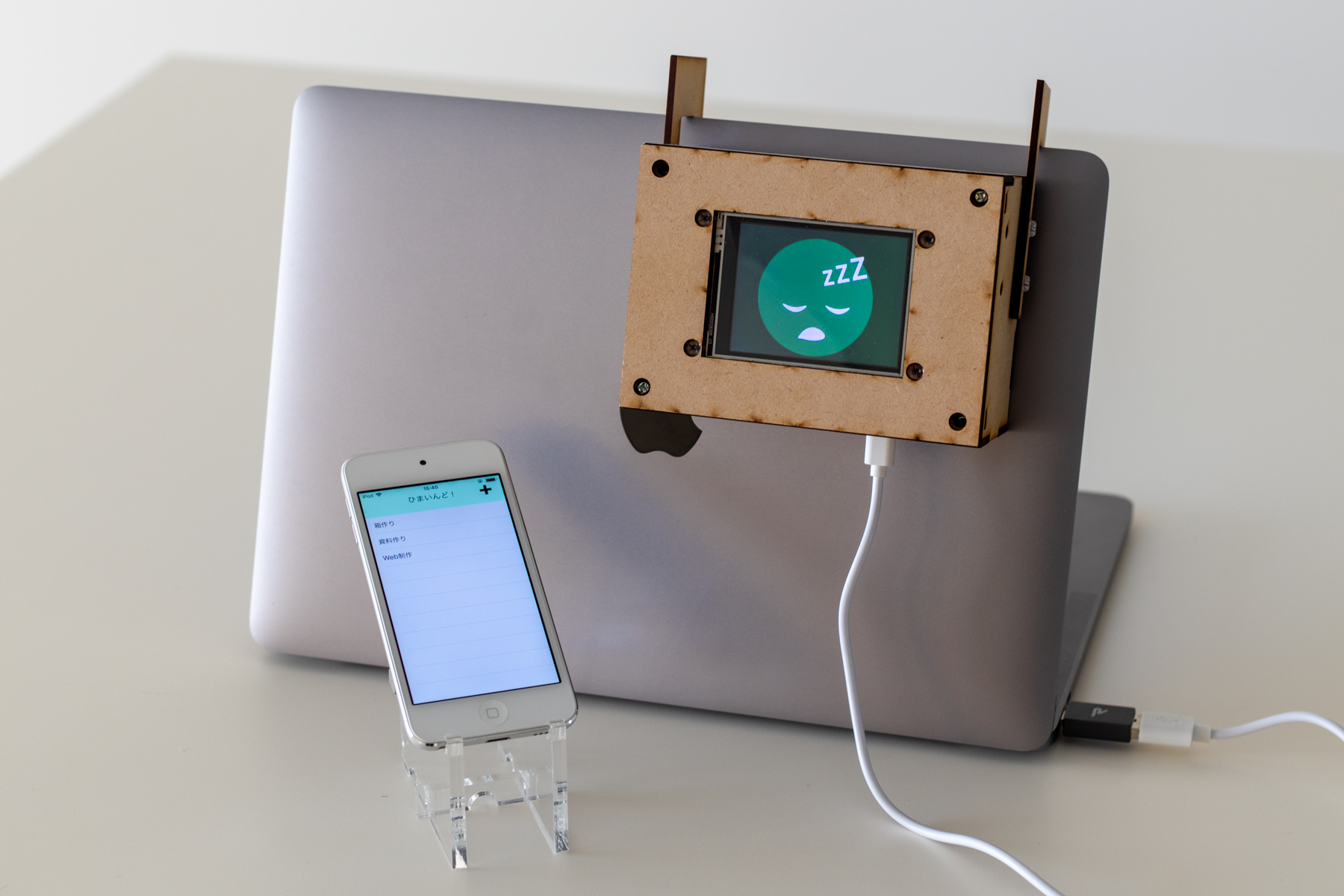 グループワーク中、自分のタスクが終了し他の人を手伝いたいが、グループメンバーが作業に集中しているため、気を遣ってしまい、なかなか声をかけることができないことがあります。 本作品は、自身のタスクが終了すると、PCに取り付けたディスプレイの表示が変化し、いまタスクを抱えていないことを周囲に知らせます。手伝ってほしい人が、周囲を見回すことで、いまタスクを抱えていない人を見つけることができます。 |