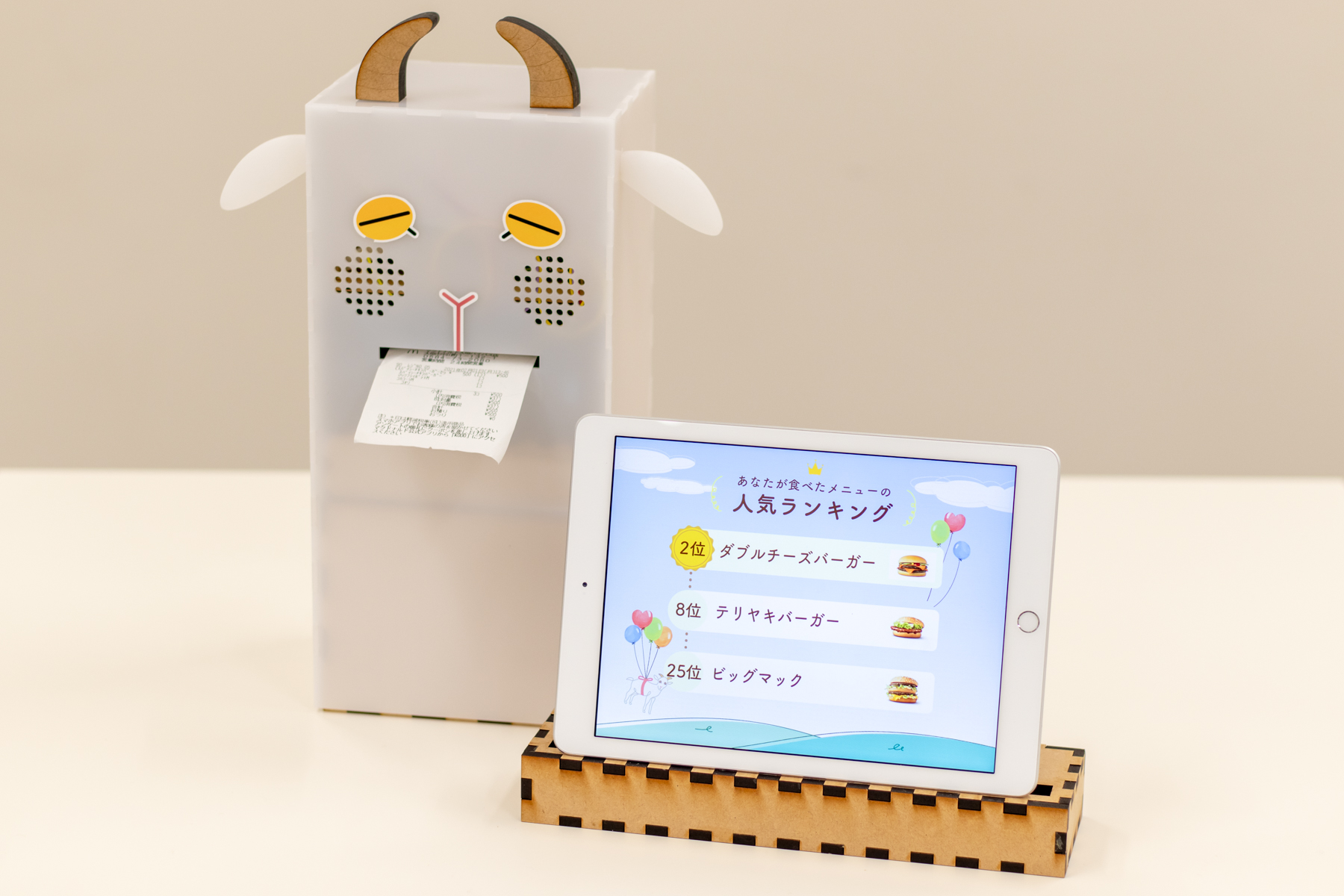新型コロナウイルスの影響で、テイクアウトが増えていることから、店内で食べる人・テイクアウトする人のどちらでも楽しめる作品を目指しました。 本デバイスは、会計時に渡されるレシートが不要な人が、レシートを読み込ませることで、自分の食べた食事が、人気ランキングで何位なのかを知ることができます。その他の食事の人気ランキングを知りたくすることで、何度もお店を訪れてもらうことを考えました。 |