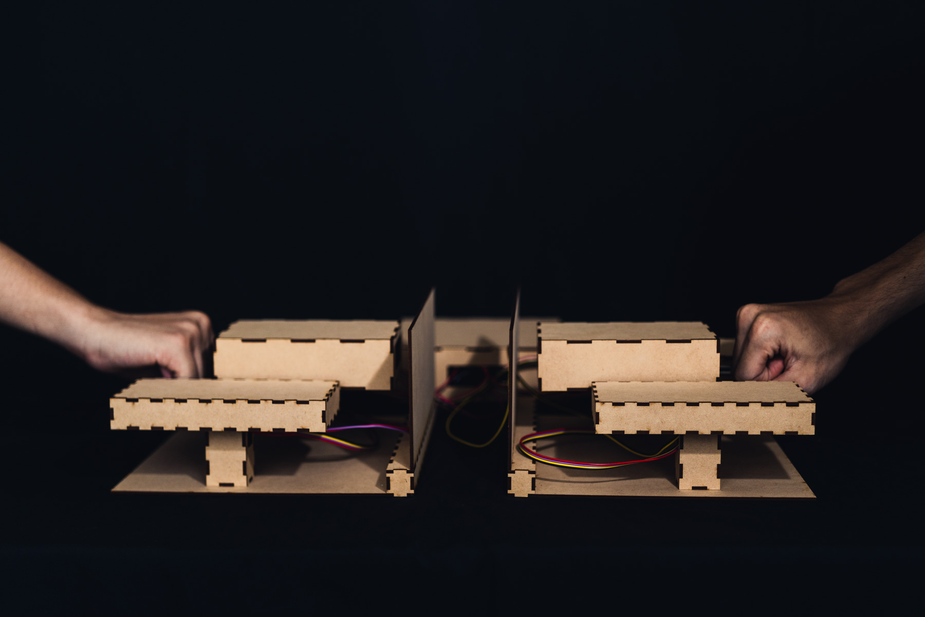 本作品は、それぞれの手の位置を検出して、相手側のデバイスを動かすことで、遠隔でグータッチを行うことができます。