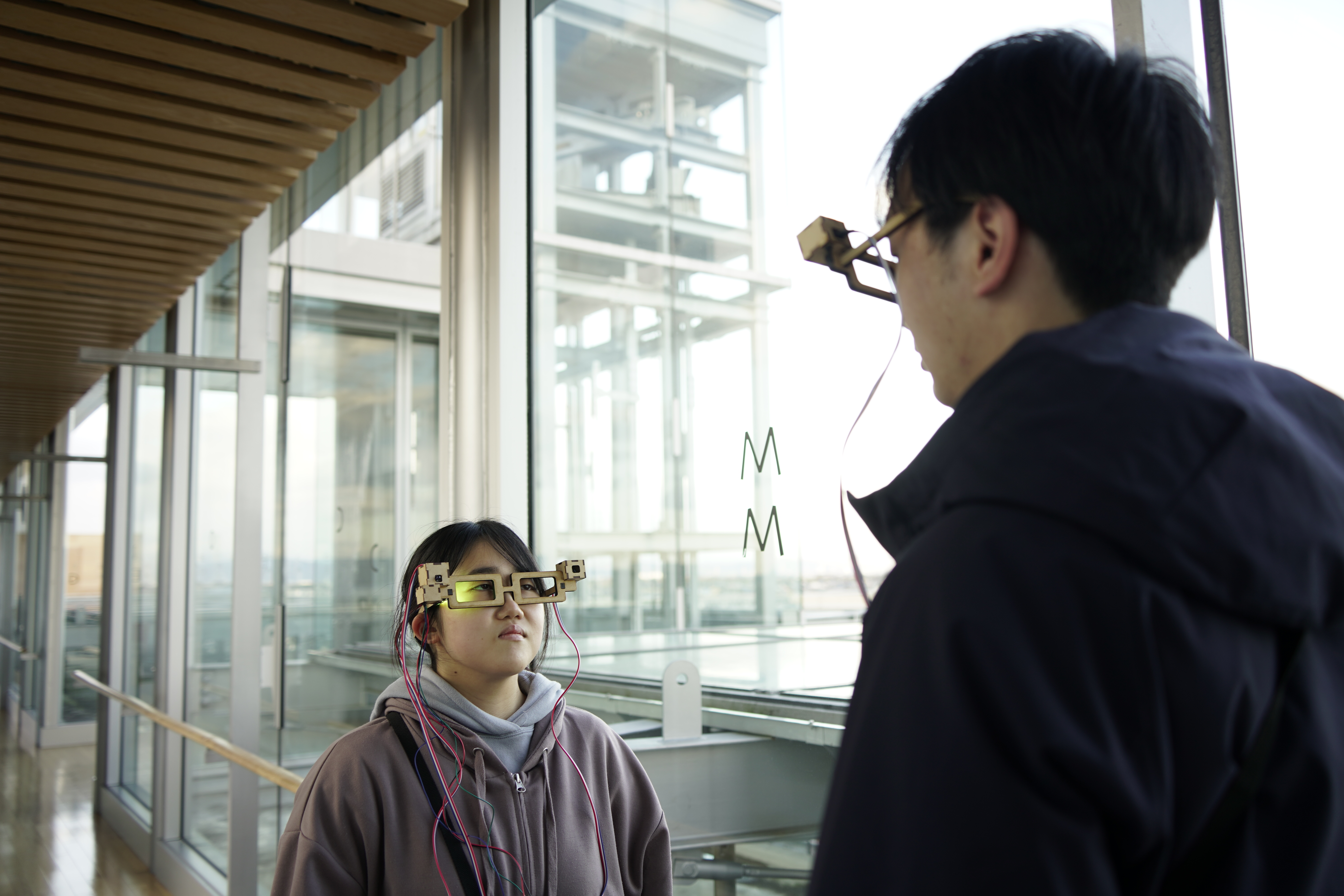 本作品は、LEDが目のそばで点灯して、相手の動きを見ないようにします。そして、適切な方向に動くことでLEDの輝度が下がるため、自然と相手と反対方向に避けられるようにします。