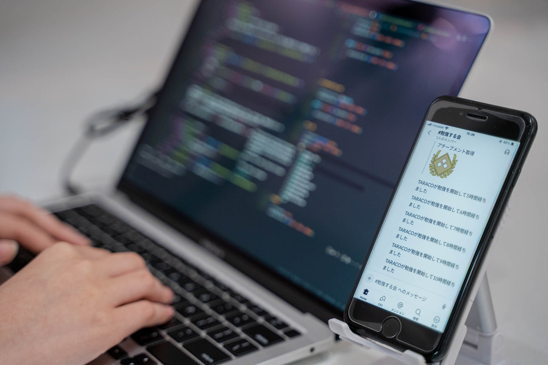 勉強や作業をする際に、他人の作業している様子を見て、自身のモチベーションを上げるということがあります。 本作品では、PCに取り付けたセンサによって作業開始を検出し、他の人と共有したチャットにメッセージを投稿します。お互いの作業開始や作業時間を把握することで、相互にやる気をかき立てます。また、長く作業することで、「称号」を得ることができるため、ゲーム的に作業のモチベーションを高めることができます。 |