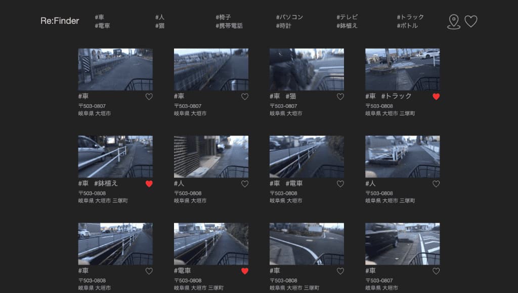 いつも通る道の風景は、意識しているとき以外は認識しておらず、記憶に残っていません。 本作品は、自転車に取り付けたスマホの専用アプリによって、定期的に風景を撮影し、AIによる物体検出を行います。写真内に物体を検出した場合は、専用サイトに撮影した位置情報と検出した物体がタグ付けされます。 普段目に入っていても、気にしていなかった風景を顕在化させることで、日常に新たな気づきを得ることができます。 |